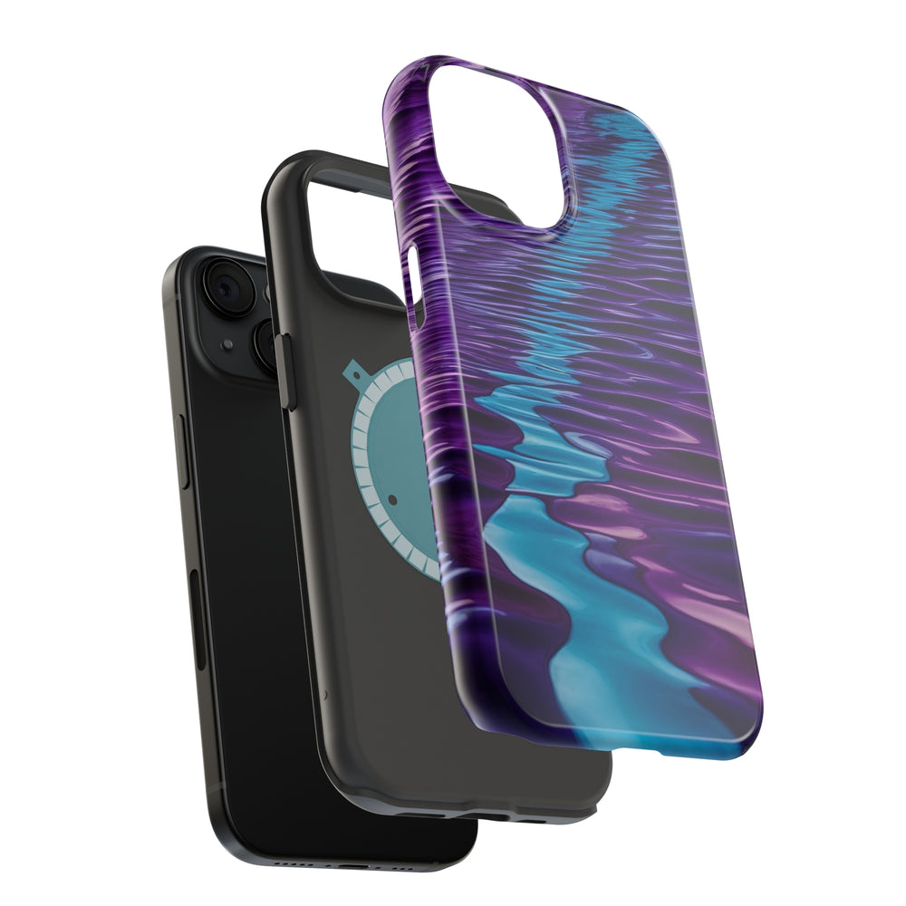 Experience the peaceful beauty of nature with the MagSafe Iphone Tough Case. This captivating case features a visually stunning fluid pattern that transitions from a deep violet to an electric blue. The organic design reflects the movement of a calm ocean in the changing light of a setting sun, adding a tranquil aesthetic to your phone. #iPhoneCase #Magsafe #ToughCase #Beauty #Aesthetic #Dynamic #Soothing #Vibrant #Natural #Organic #Peaceful