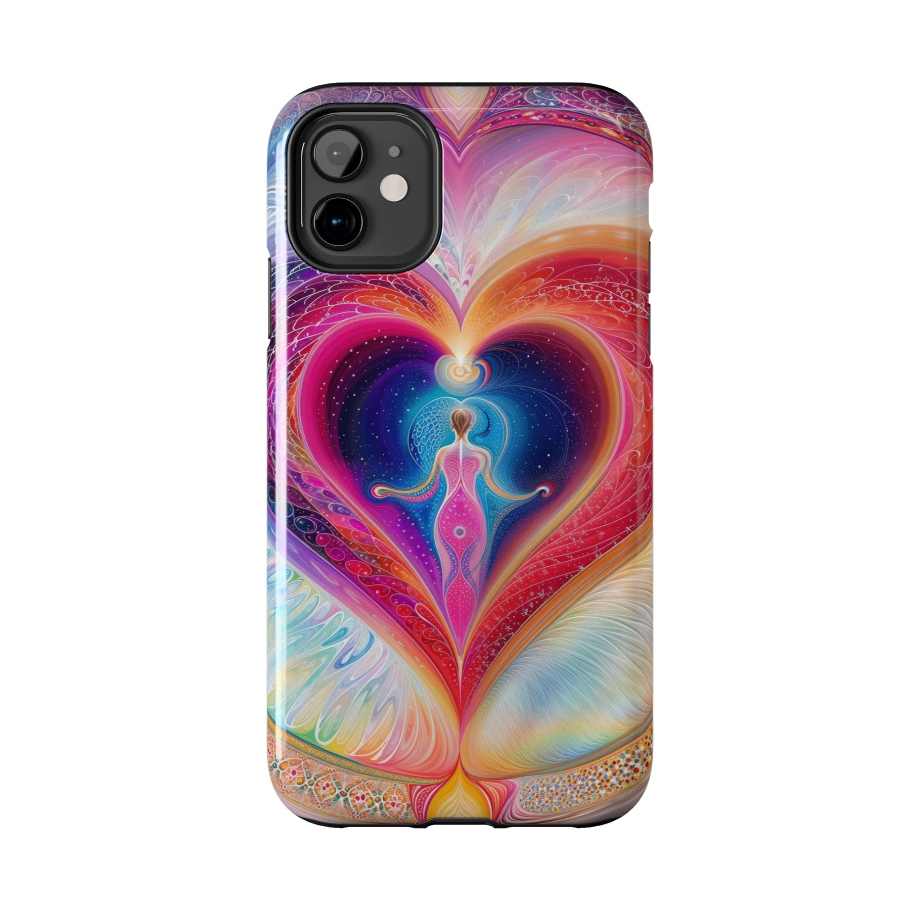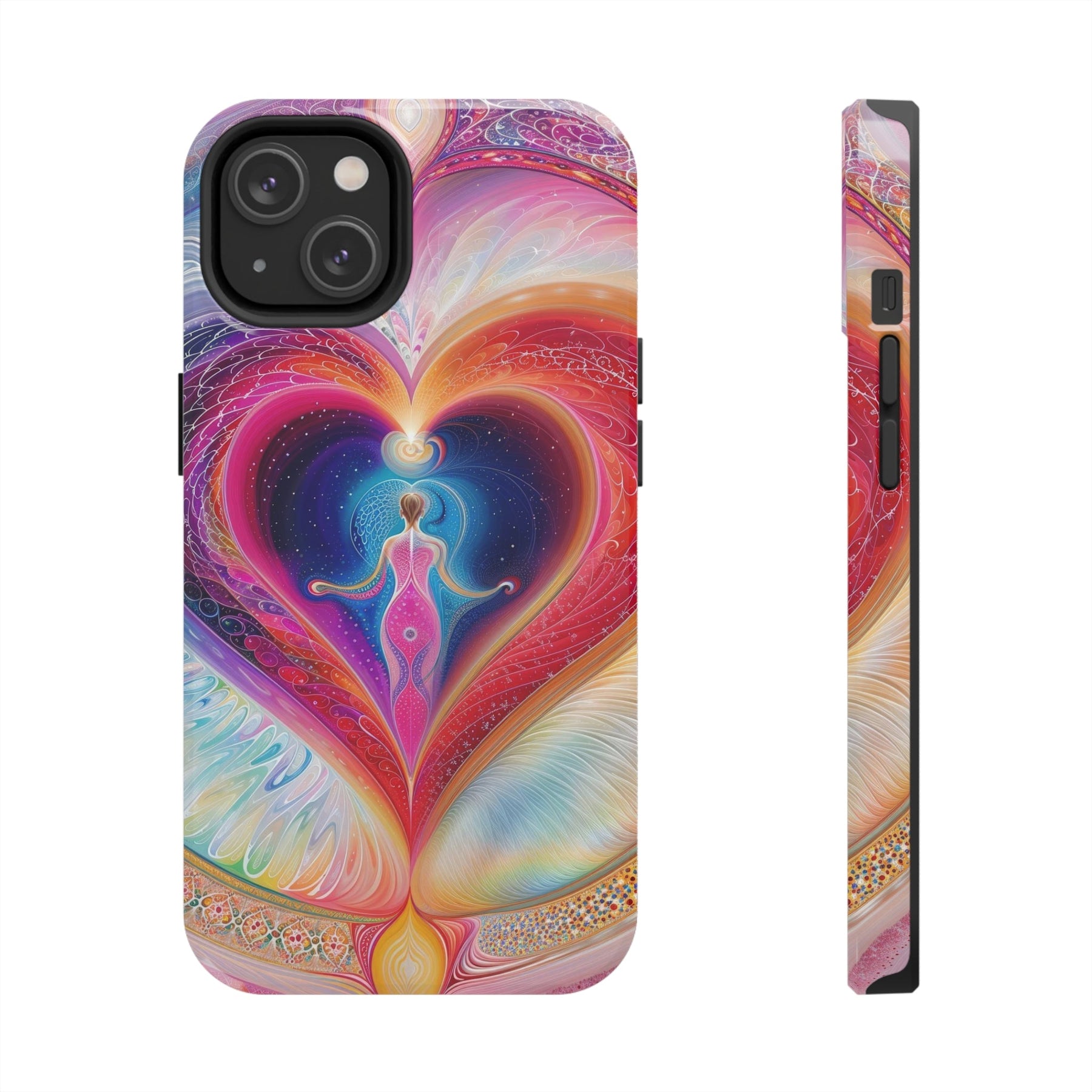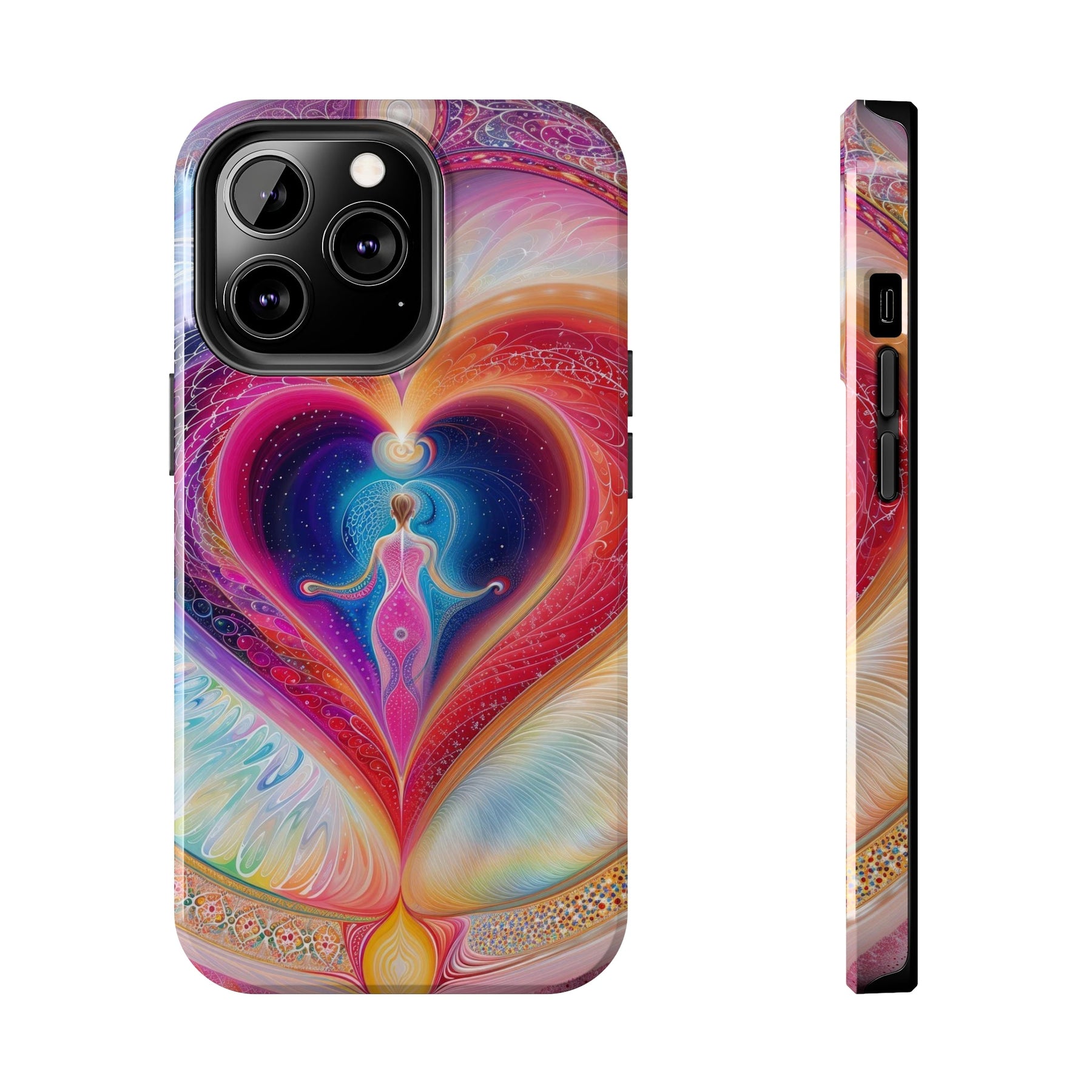 Protect your phone with this subtle yet striking Tough iPhone Case. It boasts a vibrant image combining elements of surrealism and fantasy, featuring an exquisitely rendered heart-shaped motif with a figure inside. A spectrum of colors transitions smoothly from one to another, hinting at energy or a spiritual essence. Radiating outward are intricate designs reminiscent of mandalas and Art Nouveau, with a color palette embracing all colors of the rainbow. #iPhoneCase #ProtectiveCase #ToughiPhoneCase #PremiumCase #PhoneAccessories #AppleProducts #SmartphoneProtection #iPhoneProtection #PhoneSafety #ImpactProtection #StyleMeetsProtection