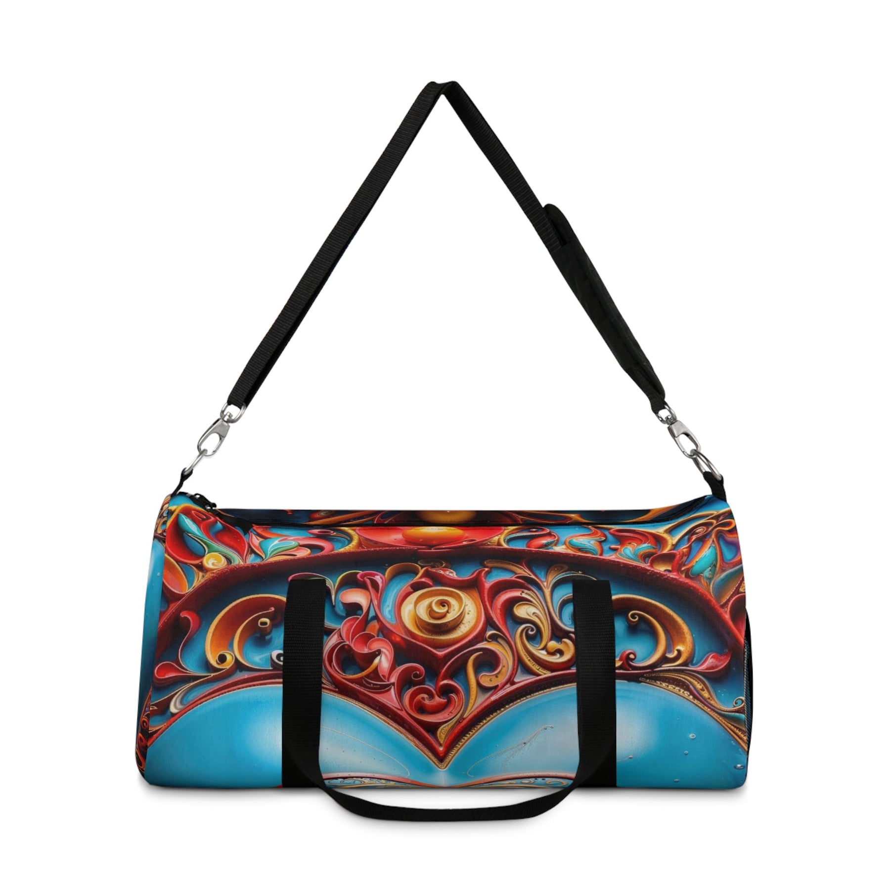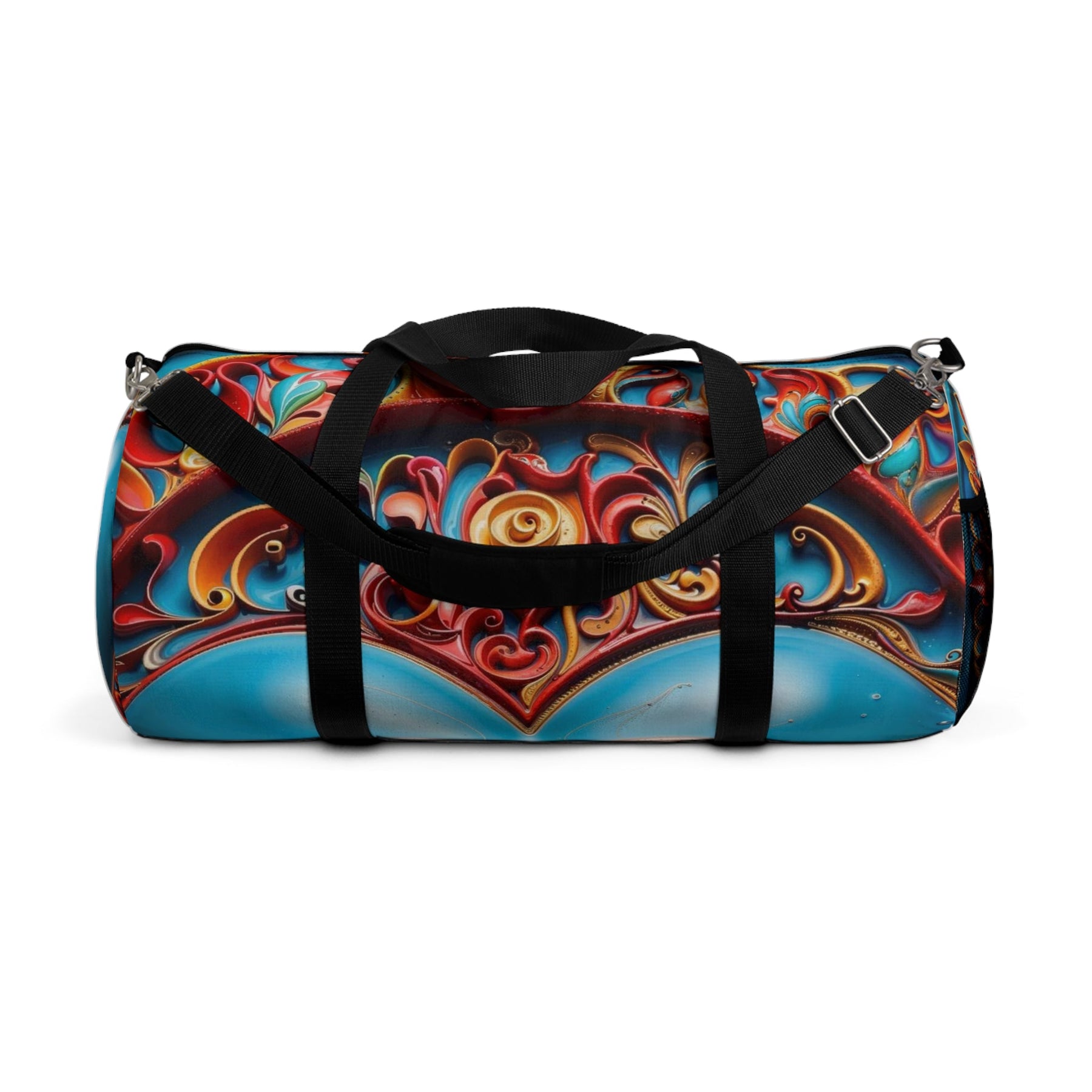 Crafted with elegant detail, this duffle bag features an intricate heart design adorned with luxurious filigree and swirled with a fluidity reminiscent of baroque and rococo influences. A cool blue background is embellished with gold accents, contrasting against the vibrant red shades and creating a bold yet harmonious dynamic. Complete with symmetrical patterns radiating out from the center heart motif, and smaller, heart-shaped designs, this magnificent bag is perfect for any stylish traveler. #dufflebag #travelaccessories #travelbag #stylebag #luxuriousbag #styleaccessories #goldbag #bluebag #redbag #stylejourney #filigreebag