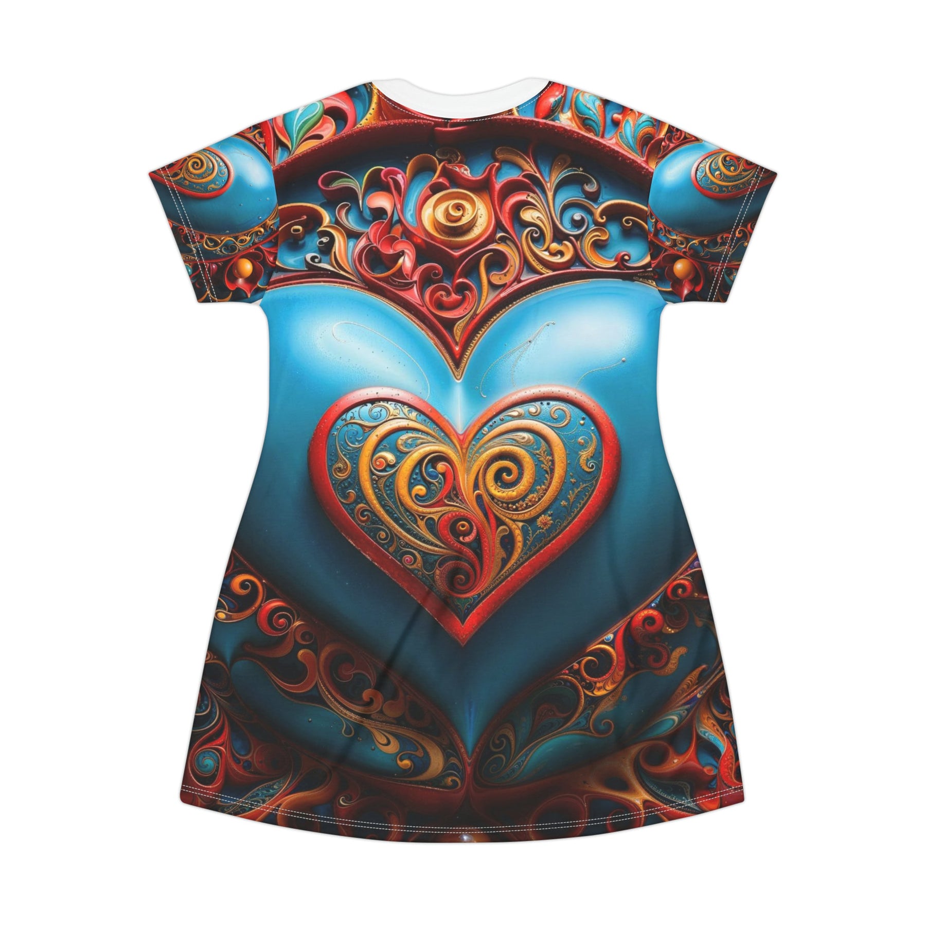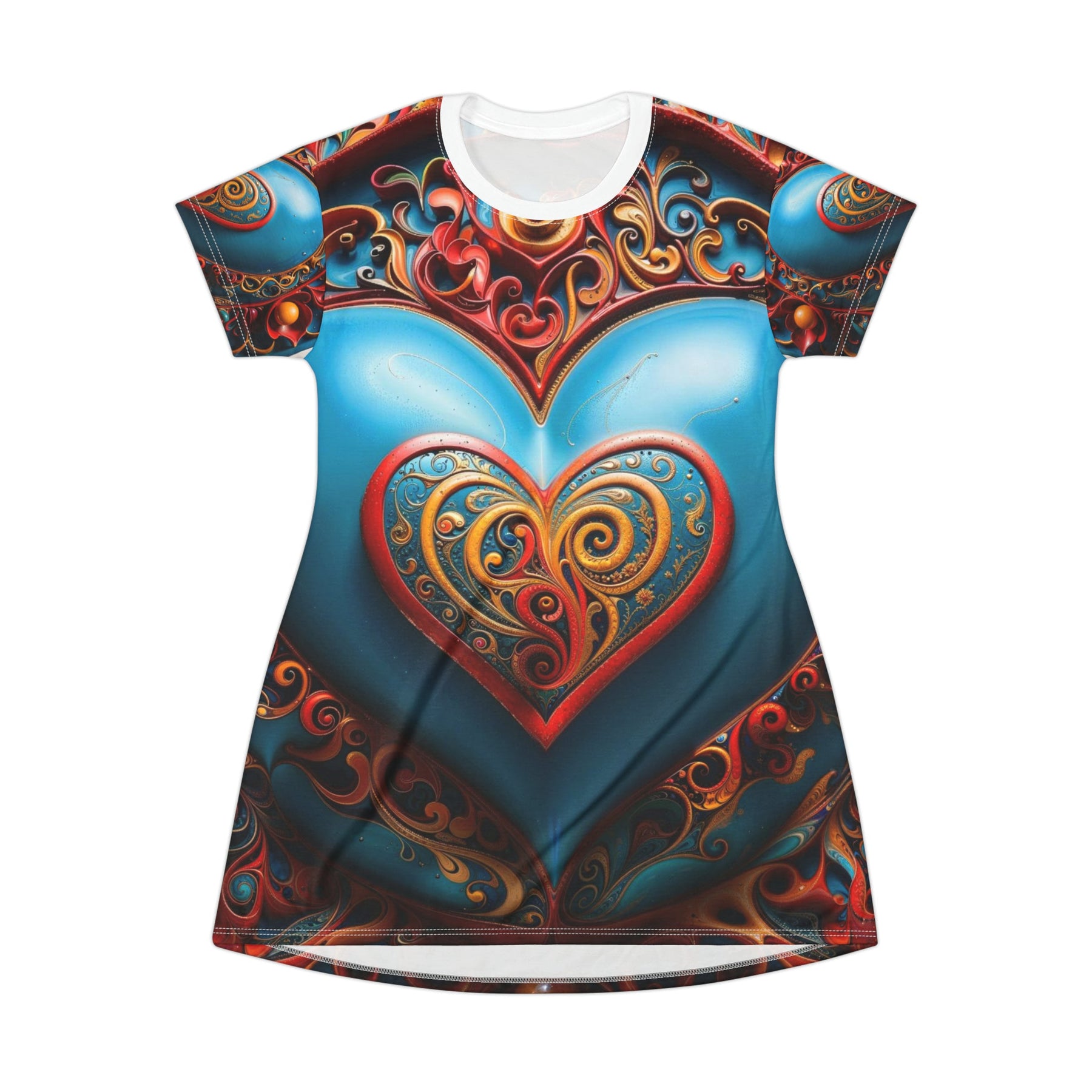 This All Over Print tee-shirt dress is a mesmerizing combination of intricate designs and vivid colors that creates an ornate piece with a luxurious feel. At its core lies a large, azure blue heart outlined by a fiery red filigree and gold detail. The symmetrical pattern creates a striking visual contrast, while the small, heart-shaped design makes it truly special. #ootd #teeshirtdress #alloverprint #redandblue #heartshapeddesign #swirlingfiligree #luxurious #golddetail #intricatedesign #vividcolors #fractal #fancy